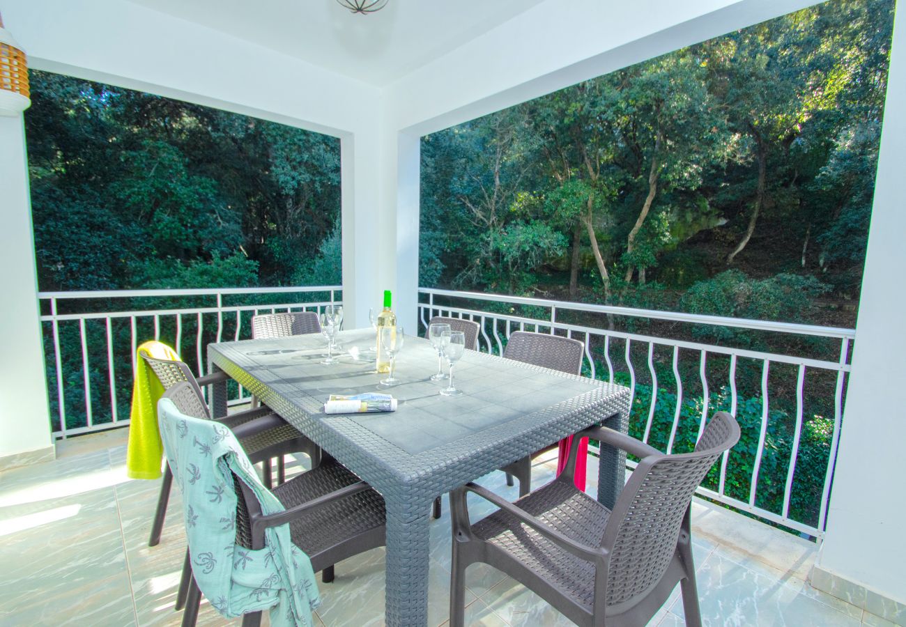 Das Äußere des Hauses hat zwei Terrassen auf zwei Ebenen. Das Ferienhaus zu vermieten verfügt über zwei bequeme Sessel und ein Sofa,Hängematten im Garten und einen Grillplatz mit Tisch und Stühlen. Auf der oberen Terrasse gibt es mehrere Hängematten, um die Sonne und absolute Privatsphäre zu genießen.
