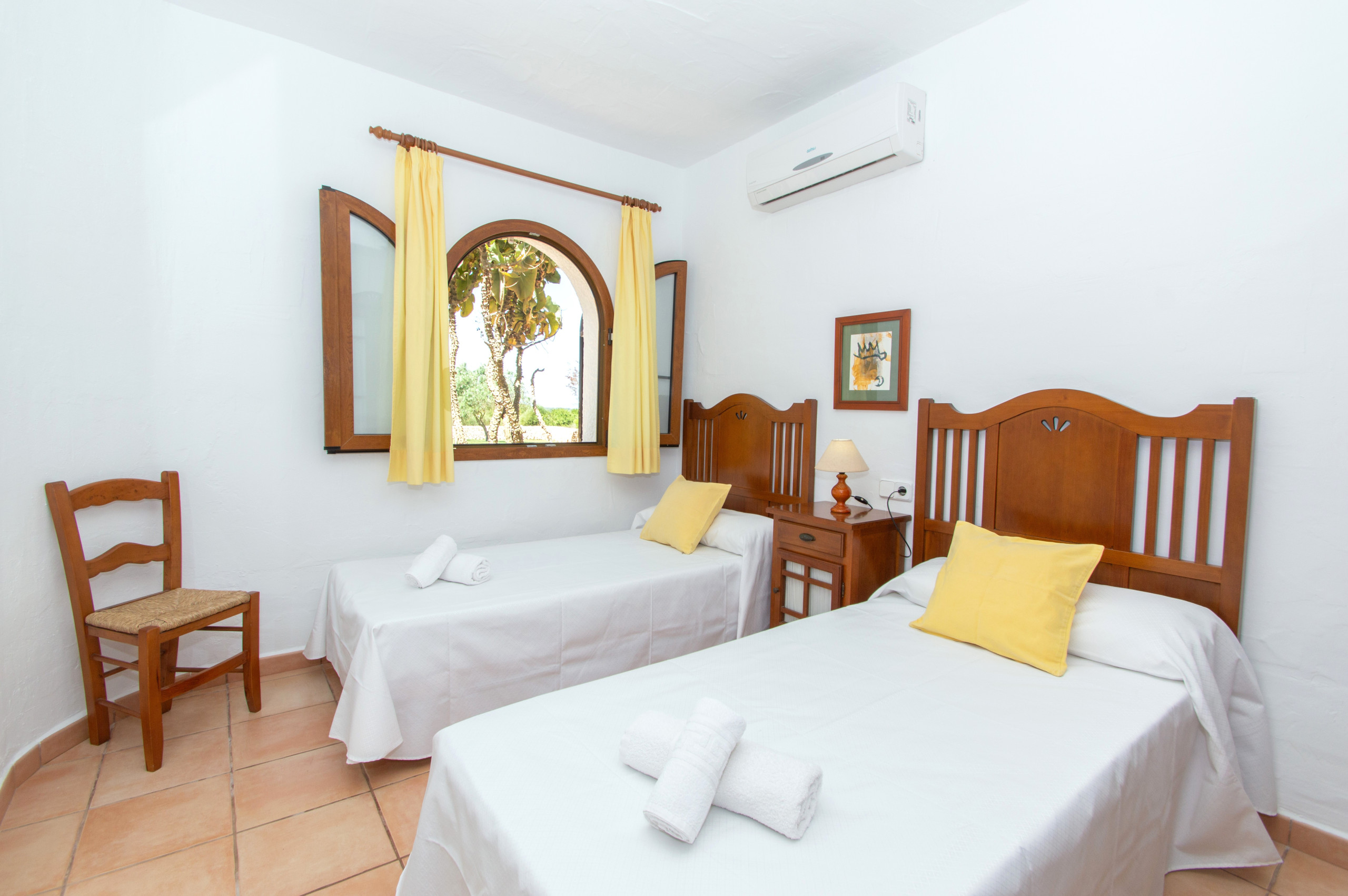 Auf der oberen Ebene befinden sich die weiteren drei Doppelzimmer. Der Hauptraum ist mit einem Doppelbett, einem großen Kleiderschrank und einem kompletten Badezimmer mit Badewanne und Haartrockner ausgestattet. Darüber hinaus hat dieses Schlafzimmer Zugang zu einem großen privaten Balkon, der eine herrliche Aussicht auf den Pool und die Landschaft der Insel bietet. Weiter unten im Flur finden wir das zweite Doppelzimmer, ausgestattet mit zwei Einzelbetten und einem Kleiderschrank. Als nächstes gibt es das andere voll ausgestattete Badezimmer mit Duschwanne. Gleich nebenan befindet sich das weitere Doppelzimmer, ausgestattet mit zwei Einzelbetten und einem großen Kleiderschrank. Alle Zimmer sind mit einer Klimaanlage ausgestattet. Im anderen Teil der Villa befindet sich das Wohnzimmer und die kleine Küche im Obergeschoss.