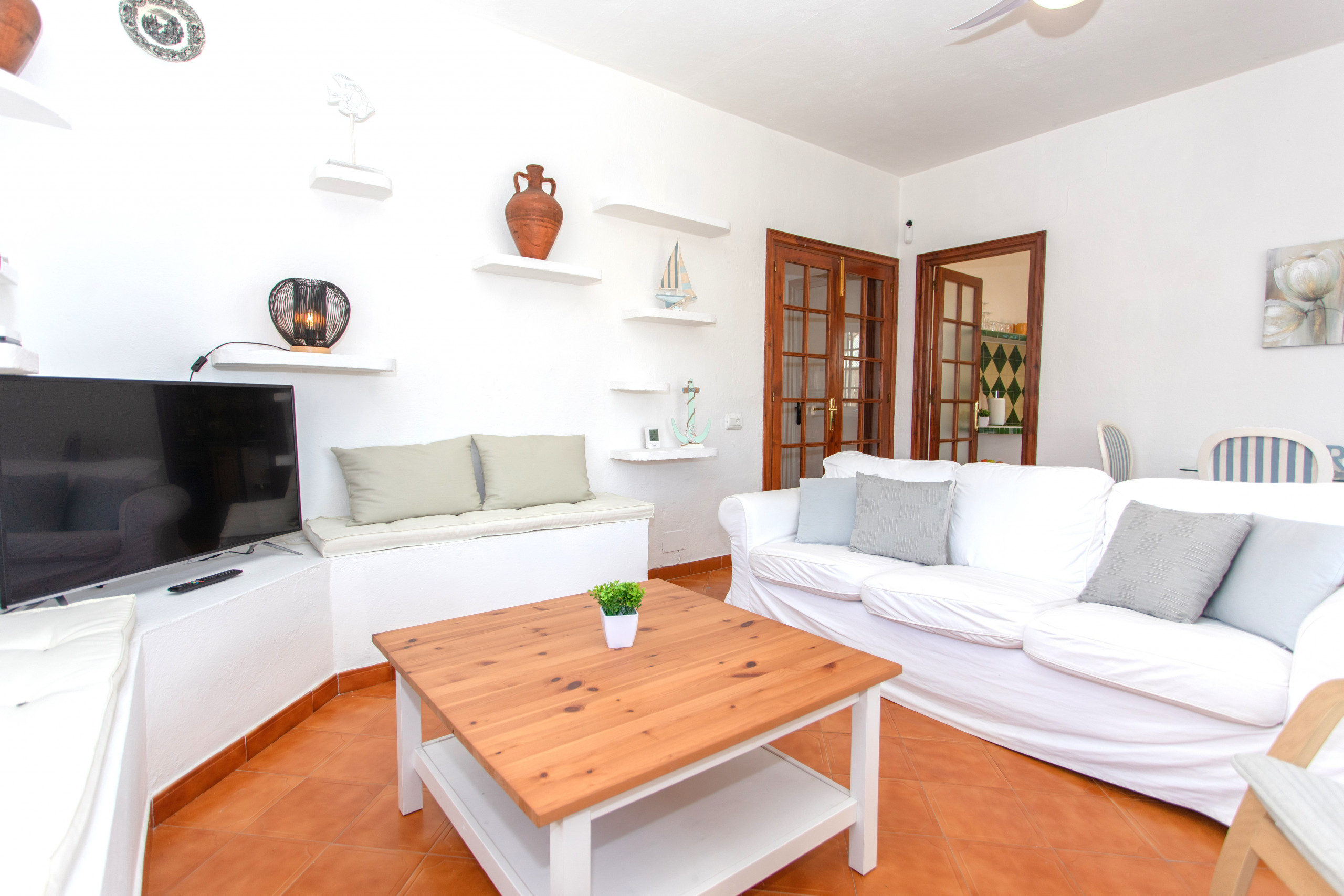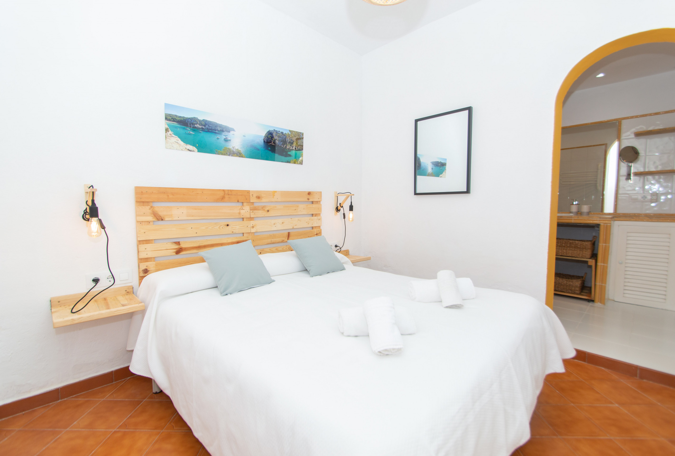 You enter Villa Asarel by stairs until you reach the main door that leads to the entrance of the apartment, which is distributed on the same level. To the right of the hall we find the wide corridor where the rooms are located. At the end of the corridor is located the fully equipped kitchen with access to the outdoor area and the pool. It has a ceramic hob, oven, dishwasher, refrigerator, microwave, coffee maker, toaster, kettle and all kitchen utensils. Next, there is the living room that is very cozy and has direct access to the balcony and the terrace where the pool is located. The living room is fully equipped with a flat-screen digital satellite TV and a ceiling fan. This is a good place to relax and enjoy a glass of wine while enjoying those summer nights outdoors.