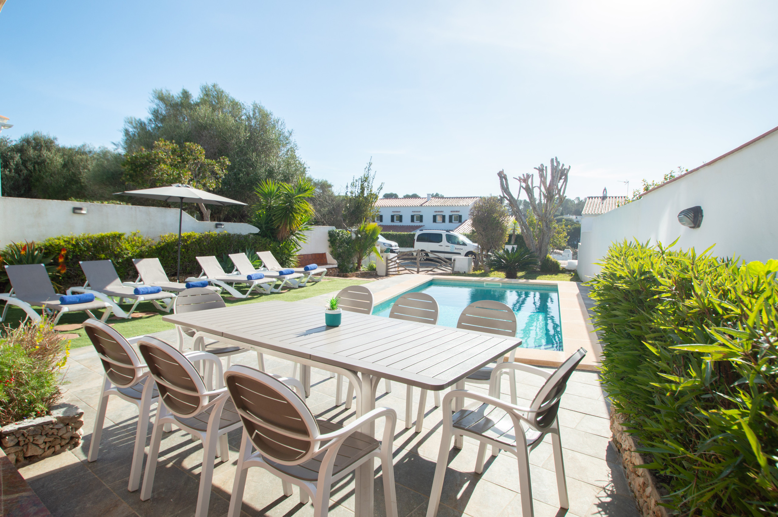 Just a few metres from the villa, you’ll find a bus stop with frequent summer service connecting to the island’s main towns. While renting a car is not essential, it is highly recommended to make the most of your stay and reach Menorca’s many unspoilt coves with ease.