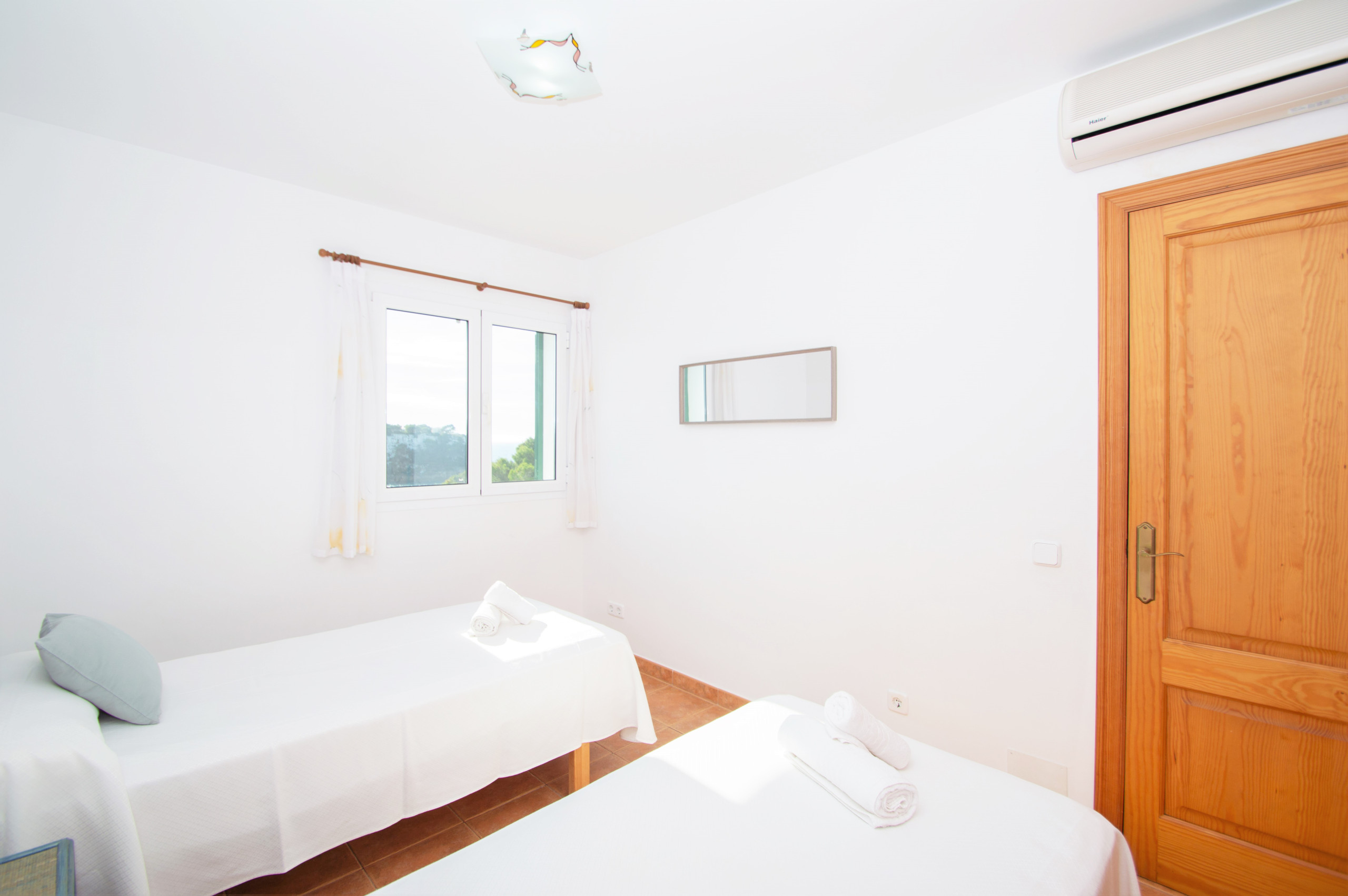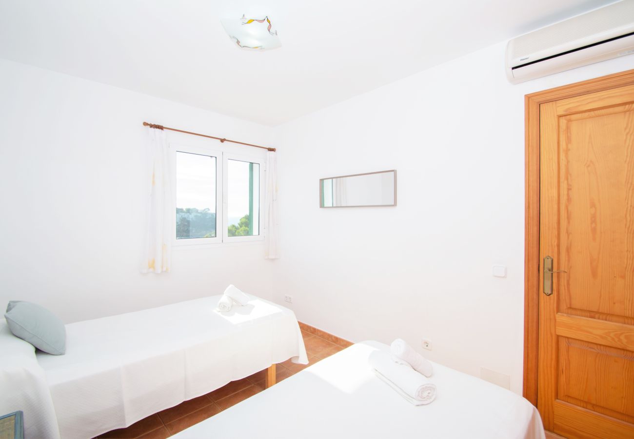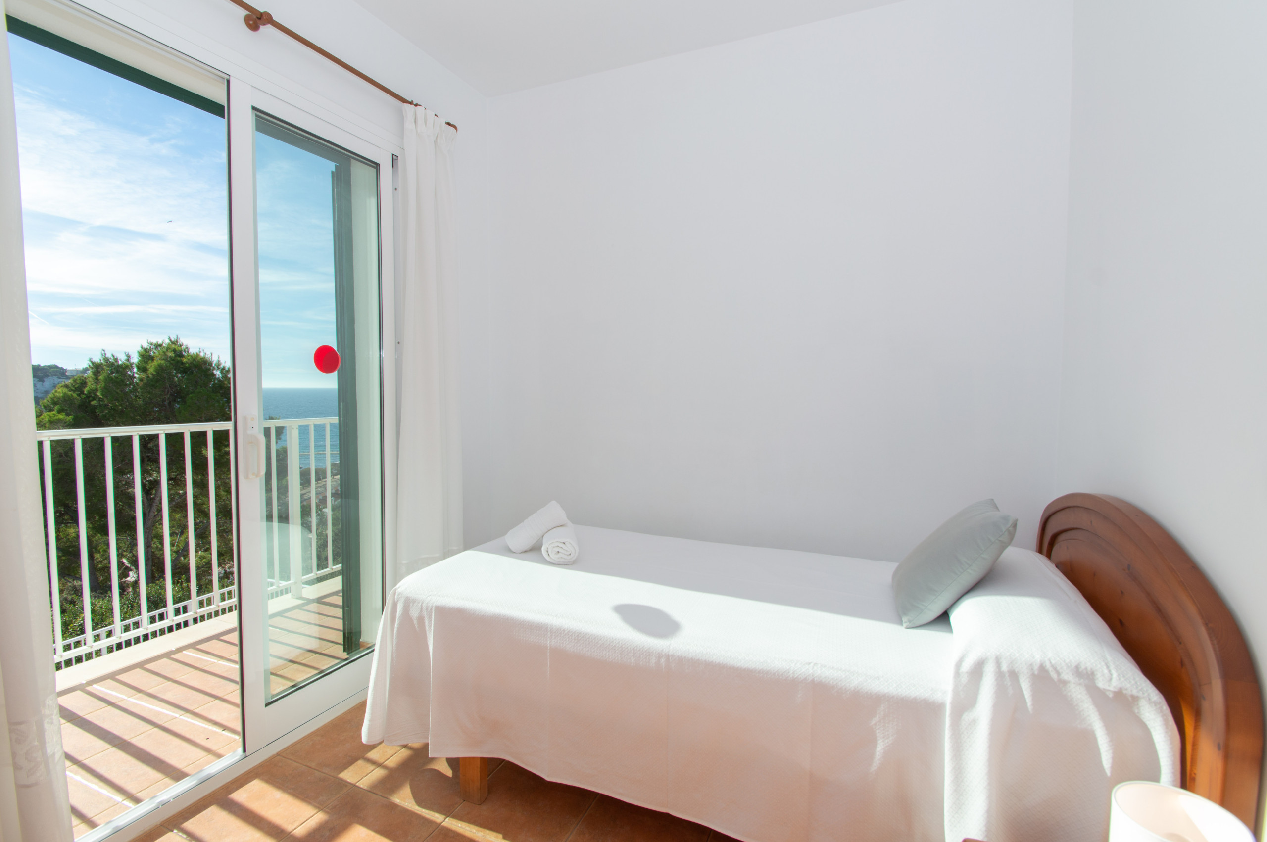 The other rooms are located on the first level. The first double room has two single beds and is equipped with a good wardrobe and air conditioning. The other bedroom is equipped with a single bed and has direct access to the balcony, which has beautiful views of the beach. Next, between the two bedrooms, we find the bathroom fully equipped with a bathtub and hairdryer. Finally, the master bedroom consists of a comfortable double bed, a large built-in wardrobe, air conditioning and a full en-suite bathroom. The bathroom is equipped with bathtub. The master bedroom also has a nice balcony and those wonderful views of the Cala Galdana beach, from the bed.