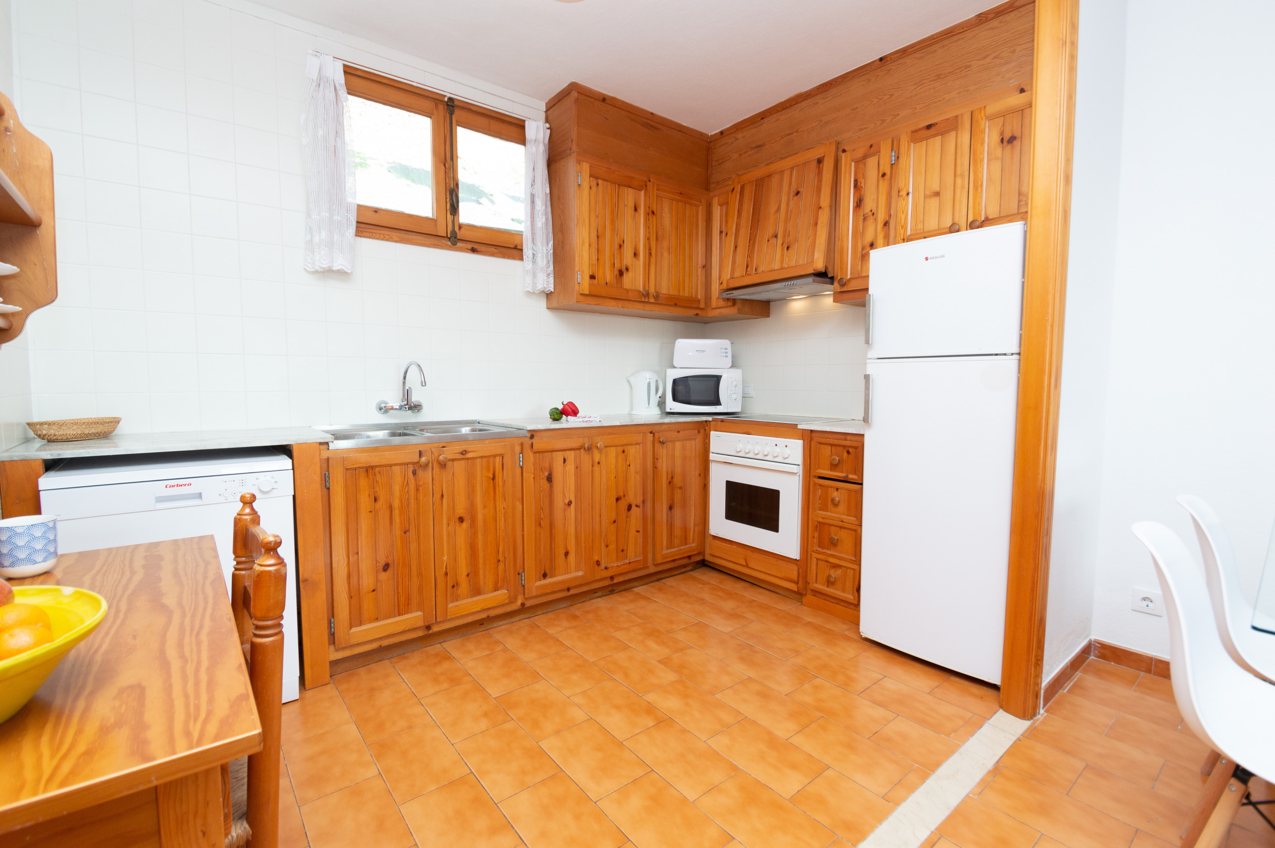 Au rez-de-chaussée de cet appartement en location à Minorque, on trouve le salon-salle à manger composé de deux canapés, d'une télévision et d'une table intérieure pour tous les convives. La cuisine est équipée de plaques de cuisson, d'un réfrigérateur, d'un four, d'un micro-ondes, d'une bouilloire, d'un grille-pain et de tout le nécessaire de cuisine.