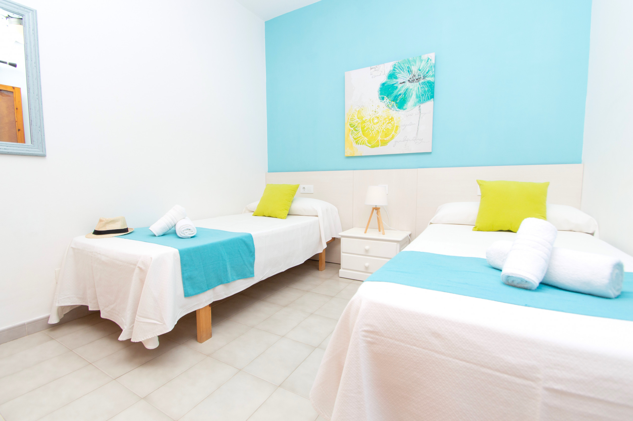 The rooms are distributed in two bedrooms with double bed, one bedroom with two single beds and the other one with one single bed. All of them have a wardrobe and a ceiling fan.