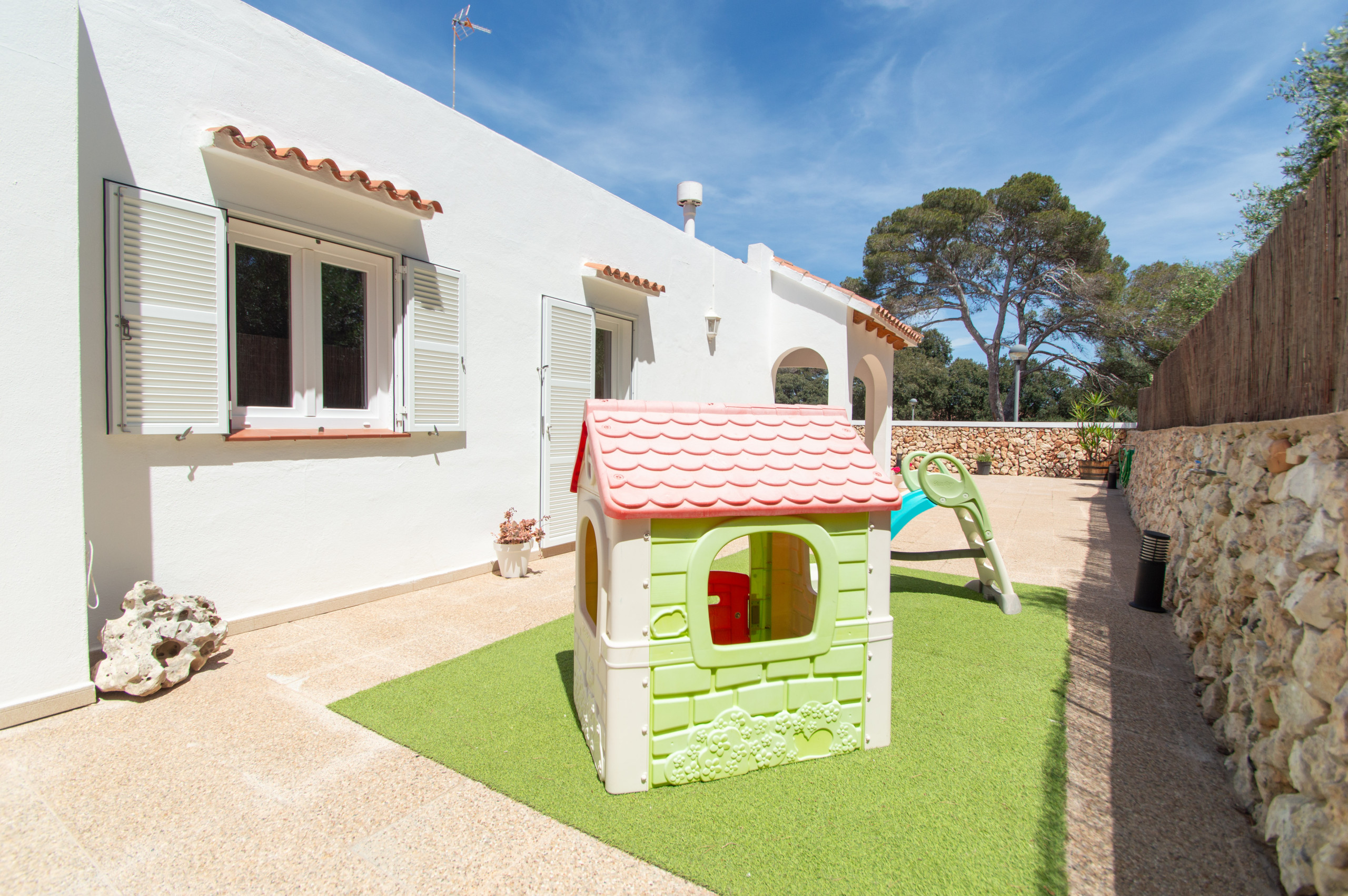 At the front of the Villa rental, it is located a large Menorcan style terrace and a landscaped area, it has a large marble table for up to eight guests and another table with comfortable chairs where you can relax watching the children playing in this wide terrace.