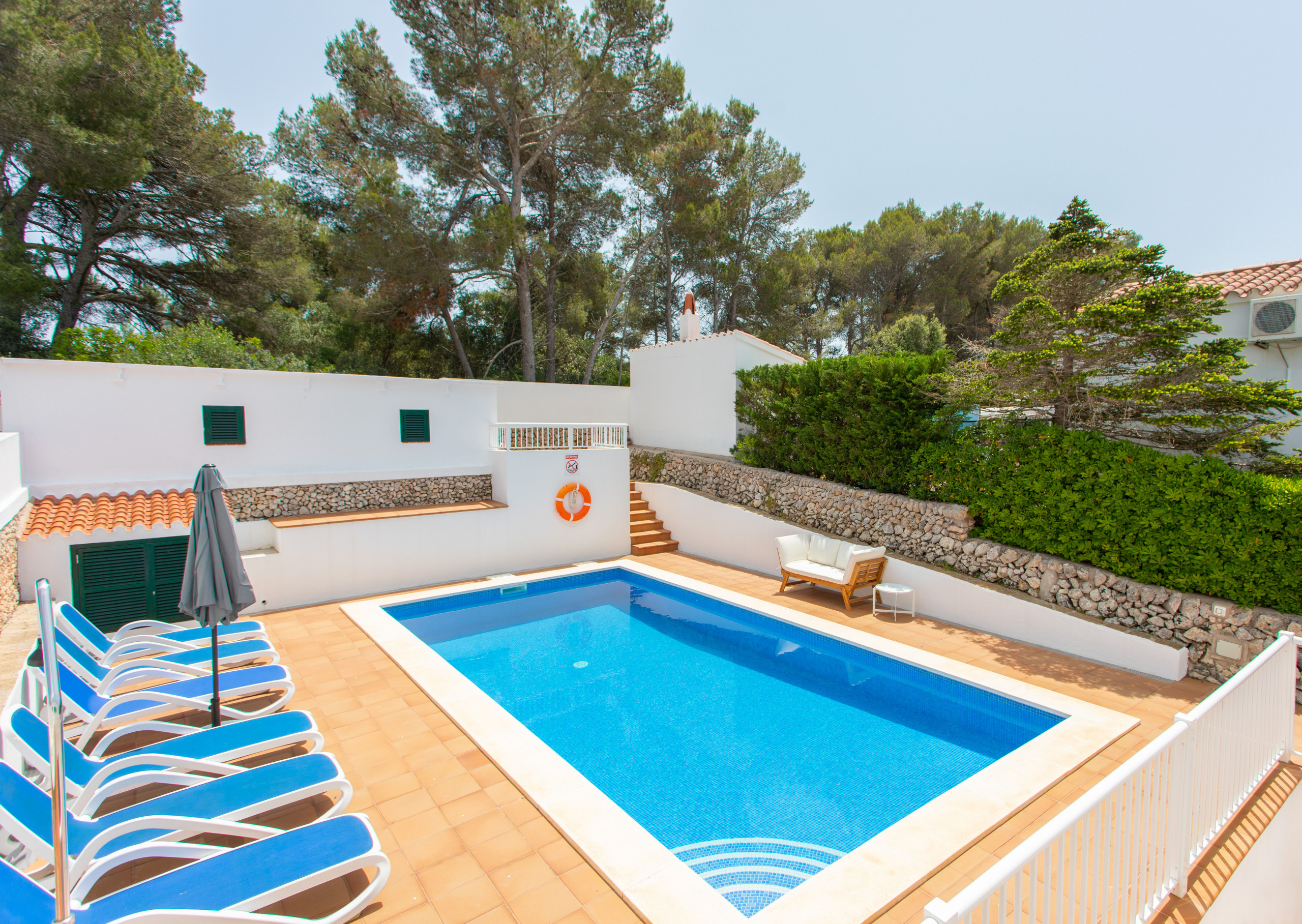 Villa à Cala Galdana qui possède 6 chambre(s) et Capacité pour 10 personnes (max. 8 adultes). Logement de 217 m² confortable et grand, avec vue sur le jardin et la piscine. La location se trouve à 300 m de la gare routière "BUS", 460 m de la plage de sable "Cala Galdana", 800 m du supermarché "Supermercado", 2 km de la plage de sable "Cala Mitjana", 3 km de la plage de sable "Cala Macarella", 7 km de la ville "Ferreries", 25 km de la ville "Ciutadella", 27 km du domaine de Golf "Golf Son Parc", 36 km de l'aéroport "Aeropuerto de Menorca (MAH)", 37 km de la ville "Mahón" et il est situé dans une zone idéale pour familles zone et dans le complexe résidentiel.Elle dispose de jardin, mobilier de jardin, clôture, terrasse, lave-linge, barbecue, fer à repasser, coffre-fort, accès internet (wifi), sèche-cheveux, climatisation, piscine privée, parking extérieur même bâtiment, 2 Télévisions, tv satellite (Langues: Espagnol, Anglais, Allemand, Français).La cuisine américaine, à gaz, est équipée avec réfrigérateur, micro-ondes, four, congélateur, lave-vaisselle, vaisselle/couverts, ustensiles/cuisine, cafetière, grille pain, bouilloire et presse-agrumes.3 avis