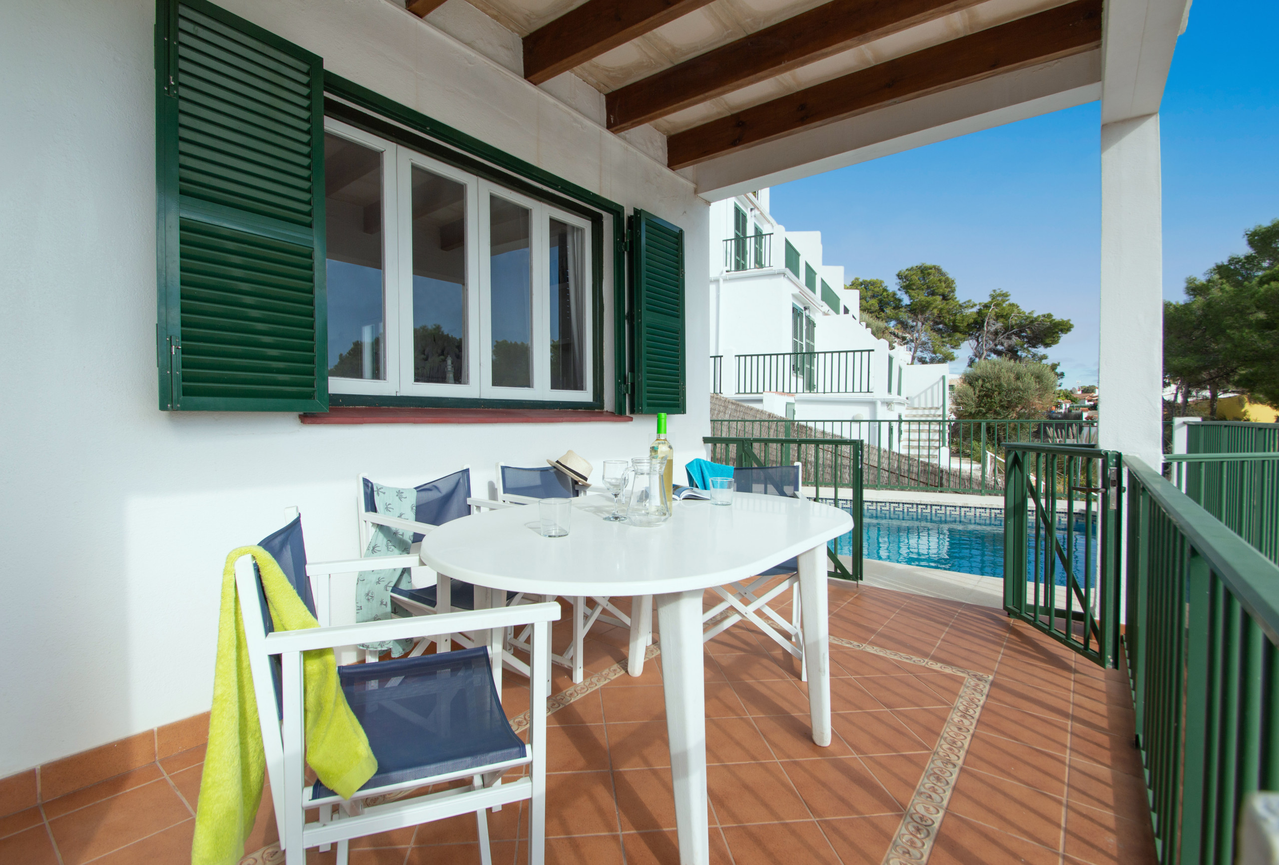 Questo piano dispone anche di un balcone dove poter godere dei pasti all'aperto con il paesaggio di Cala Galdana come sfondo. L'area esterna è composta da una piscina privata con lettini. L'appartamento in affitto a Minorca è dotato di aria condizionata e Wi-Fi.